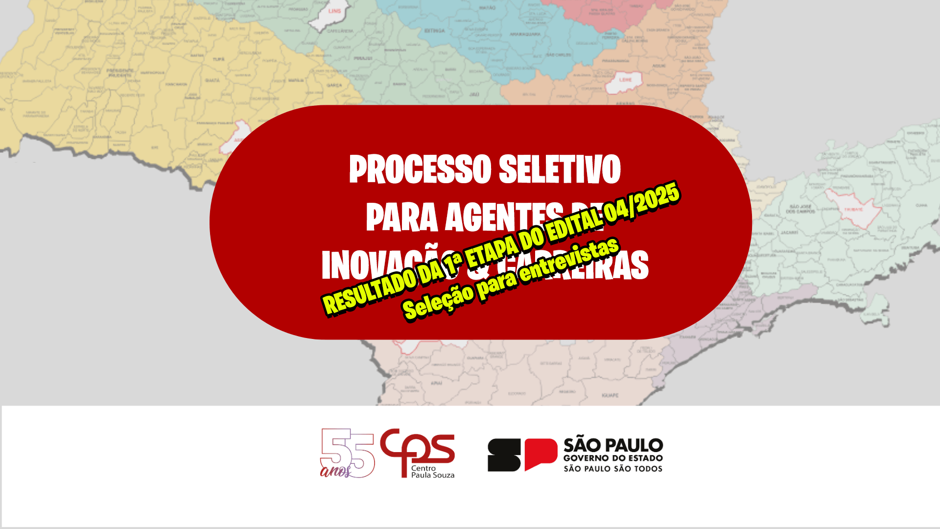 O EditaL 04/2025 apresenta as normas e critérios do Processo Seletivo de Agente de Inovação e Carreiras junto à INOVA CPS que irão atuar a partir de 25/08/2025. O Processo é composto de duas etapas e a seguir a lista com resultado da 1ª etapa (Análise Curricular) e que serão convocados para a 2ª etapa, Entrevistas.